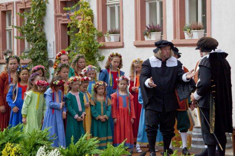 Nächstes Bild Heimatspiel2016_Kinder_Presse Inbrünstig beten die kleinen und großen Münnerstädter, dass ihre Heimatstadt von den Schweden verschont wird. Mit Erfolg, wie der Verlauf des historischen Volksschauspiels „Die Schutzfrau von Münnerstadt“ zeigen wird. Foto Christine Schikora
